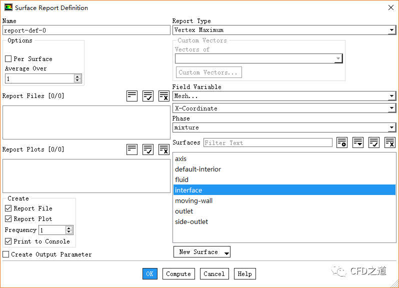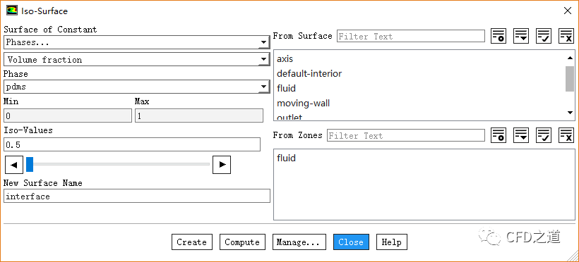 如下图所示定义等值面interface为相pdms的体积分数为0.5,点击按钮Create创建等值面