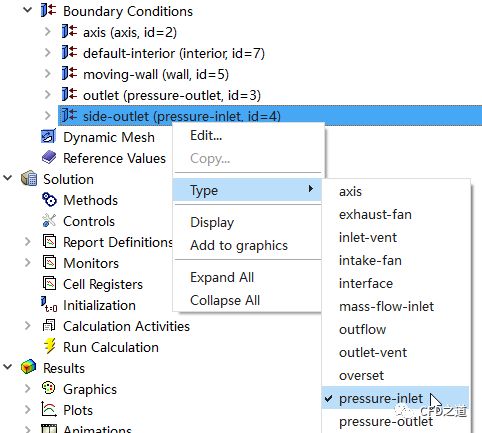 修改边界side-outlet的类型为pressure inlet,采用默认参数。