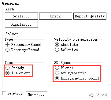 双击模型树节点General,右侧面板选择选项Transient及Axisymmetric Swirl