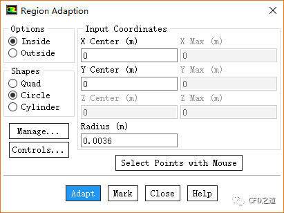 如下图所示设置一个坐标原点(0,0),半径0.0036 m的圆,点击Mark按钮进行标记