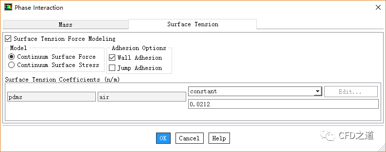 鼠标双击模型树节点Models > Multiphase > Phase > Phase Interactions,如下图所示,设置表面张力系数为0.0212,激活选项Wall Adhesion
