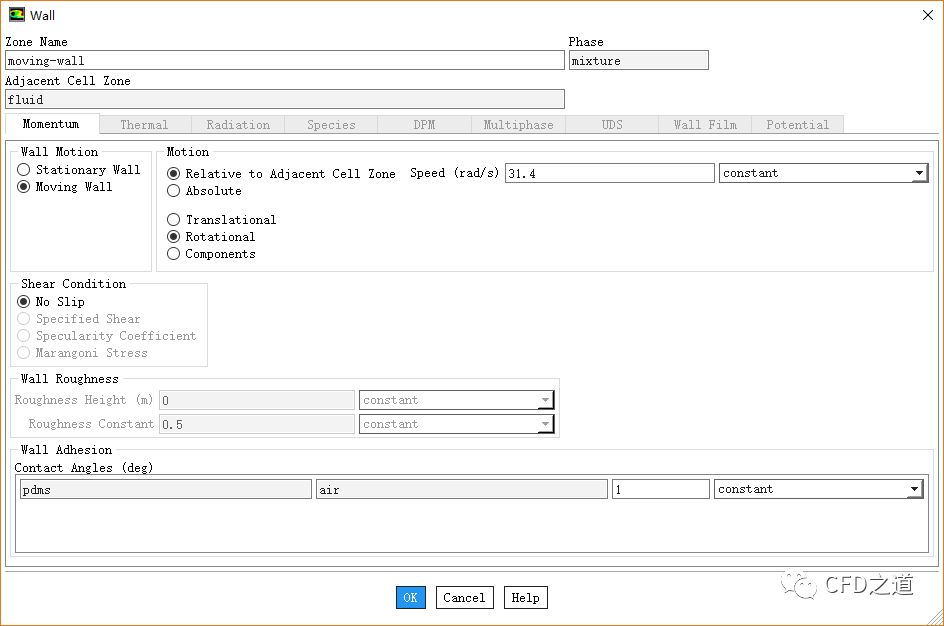如下图所示,设置该边界旋转速度为0,指定Contact Angles为30 deg