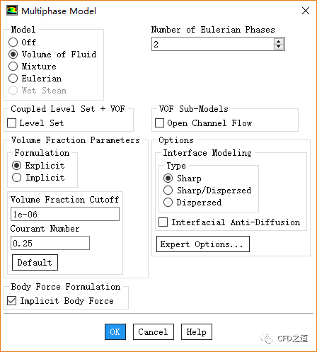 选择模型Volume of Fluid,激活选项Implicit Body Force,其他参数保持默认设置