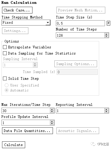 双击模型树节点Run Calculation,右侧面板中设置Time Step Size为0.4 s,设置Number of Time Steps为165,设置Max Iterations/Time Step为30,点击按钮Calculate开始计算