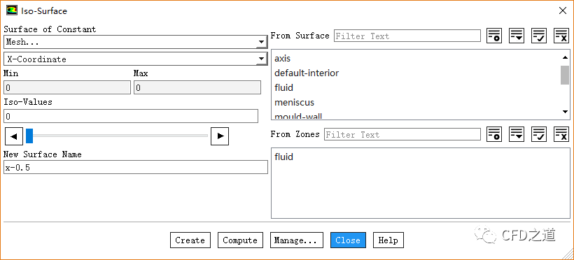 利用工具栏按钮Surface → Create → ISO Surface创建x=0.5, 1.0, 1.5, 2.0, 2.5及3.0m的面