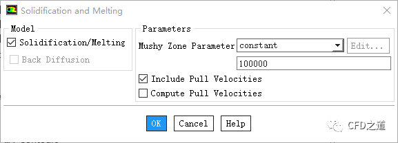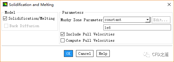 双击模型树节点Models > Solidfication & Melting,弹出设置对话框,如下图所示,激活选项SolIdfication/Melting,选择选项Include Pull Velocities,其他参数保持默认设置,点击OK按钮关闭对话框