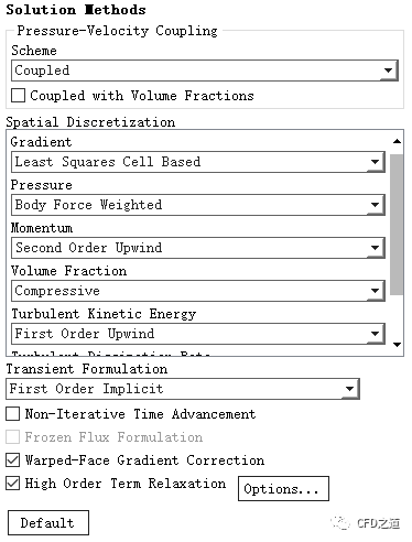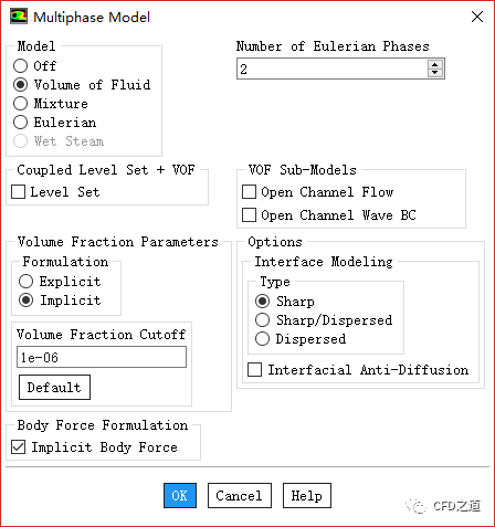 双击模型树节点Models > Multiphase,弹出对话框中激活Volume of Fluid,激活选项Implicit Body Force,其他参数如下图所示进行设置