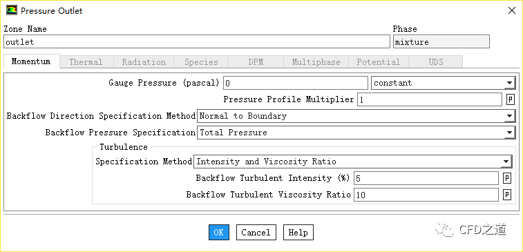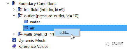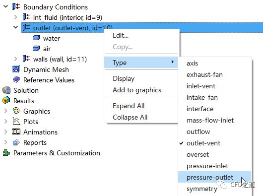 右键选择模型树节点Boundary Conditions > outlet,选择弹出菜单项Type → Pressure-outlet将其边界类型改为压力出口