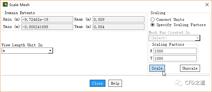 点击按钮Scale...,打开网格缩放对话框,激活选项Specify Scaling Factors,设置缩放因子为1000,点击按钮Scale缩放网格