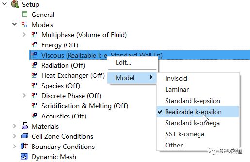 右键选择模型树节点Models > Viscous,点击弹出菜单项Model → Realizable k-epsilon激活湍流模型