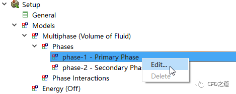 右键选择模型树节点Models > Multiphase > Phases > Phase-1-Primary Phase,点击弹出菜单项Edit...