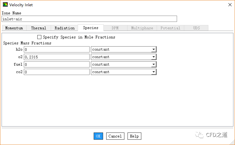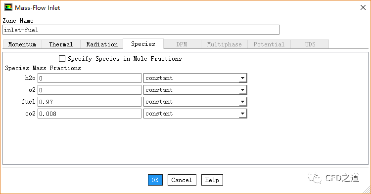 切换至Species标签页,设置fuel为0.97,co2为0.008