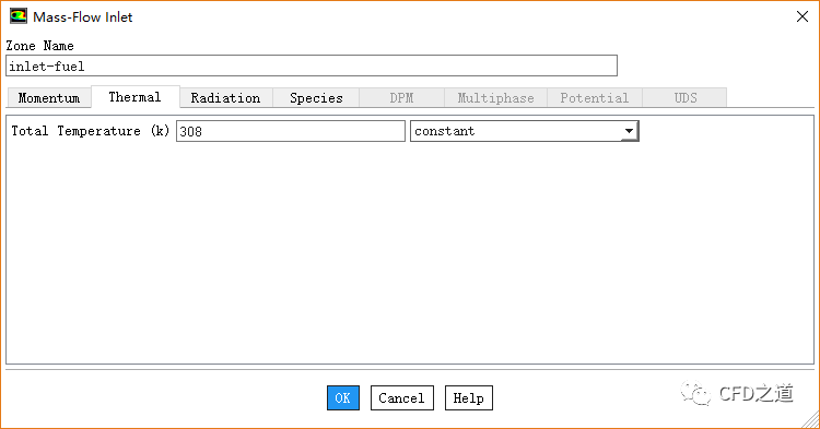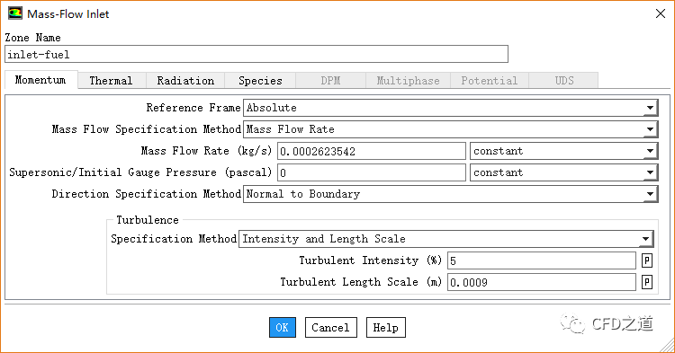 鼠标双击模型树节点Boundary Conditions > inlet-fuel,弹出边界设置对话框