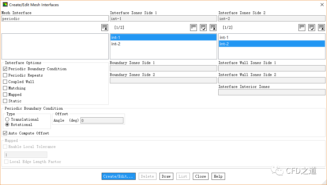 如下图所示创建interface,注意激活选项Periodic Boundary Condition,并设置Type为Rotational,选中选项Auto Compute Offset