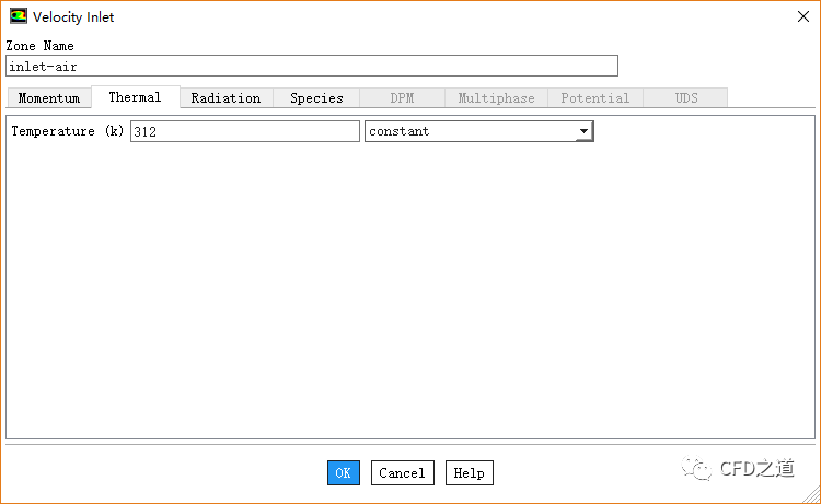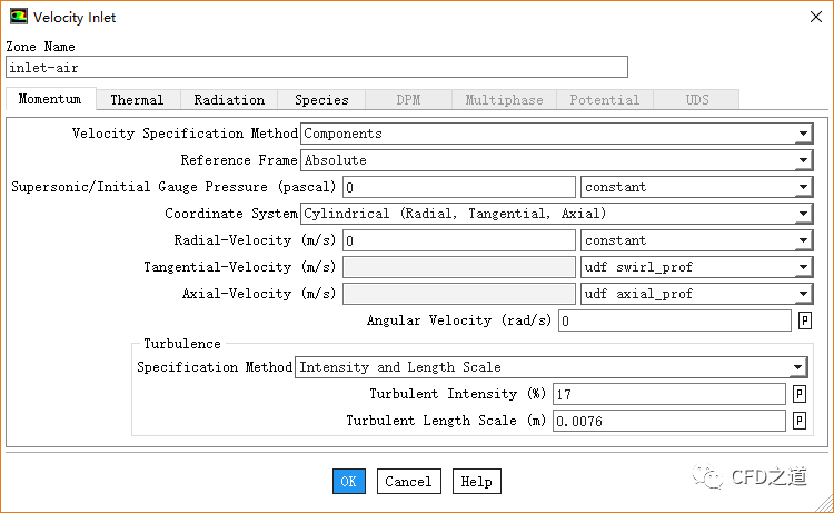 鼠标双击模型树节点Boundary Conditions > inlet-air,弹出边界设置对话框