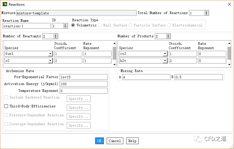 点击Create/Edit Materials对话框中Reaction右侧的Edit...按钮,弹出化学反应定义对话框,按下图所示参数定义化学反应