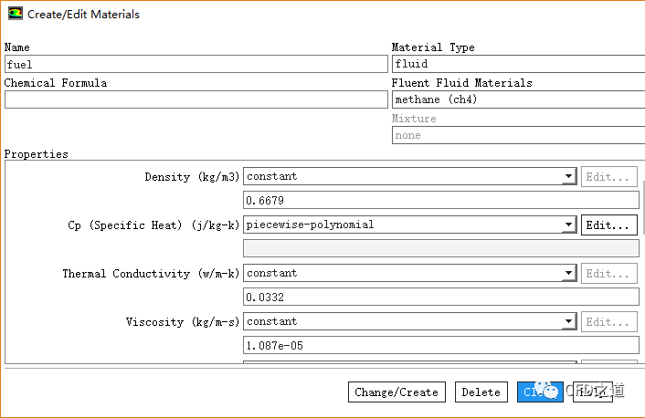 修改材料Methane名称为fuel,去除Chemical Formula中的内容,点击按钮Change/Create修改材料