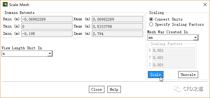 选择Mesh Was Created In选项为mm,点击Scale按钮缩放网格