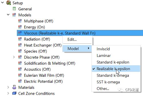 右键选择模型树节点Models > Viscous,选择弹出菜单Models → Realizable k-epsilon激活湍流模型