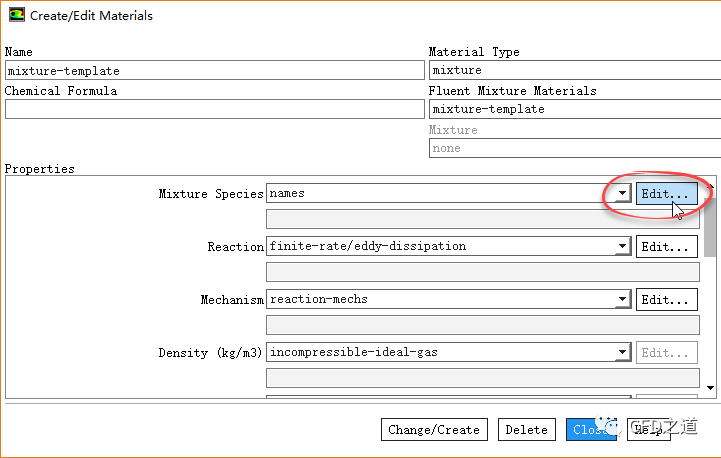 鼠标双击模型树节点Materials > Mixture > mixture-template弹出Create/Edit Materials对话框