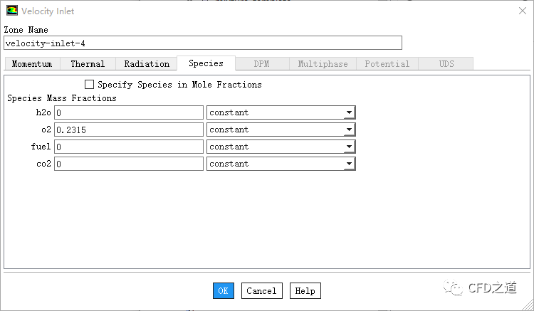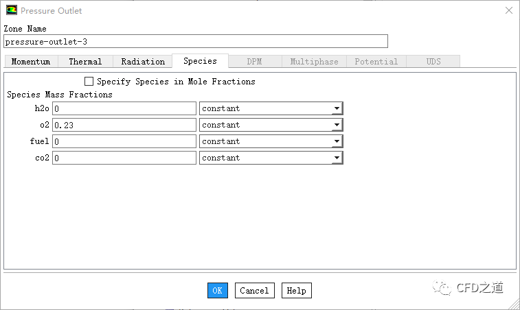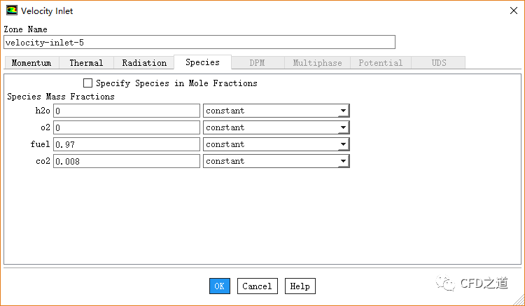 切换至Species标签页,设置fuel为0.97,co2为0.008