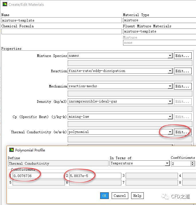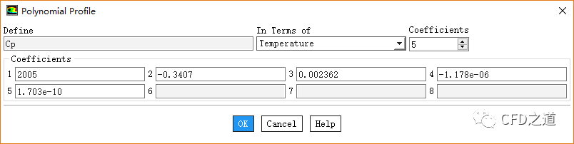 同理设置Viscosity为polynomial,并设置系数为7.6181e-6及3.2623e-8,点击OK按钮关闭对话框