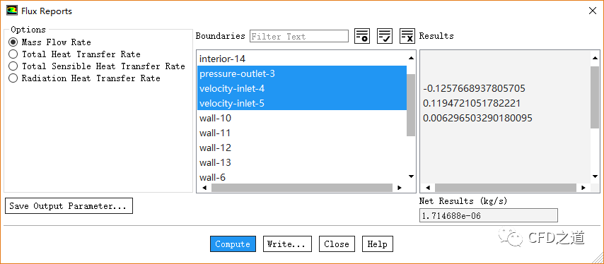 选择Mass Flow Rate,边界列表中选择pressure-outlet-3 、velocity-inlet-4、velocity-inlet-5,点击Compute按钮