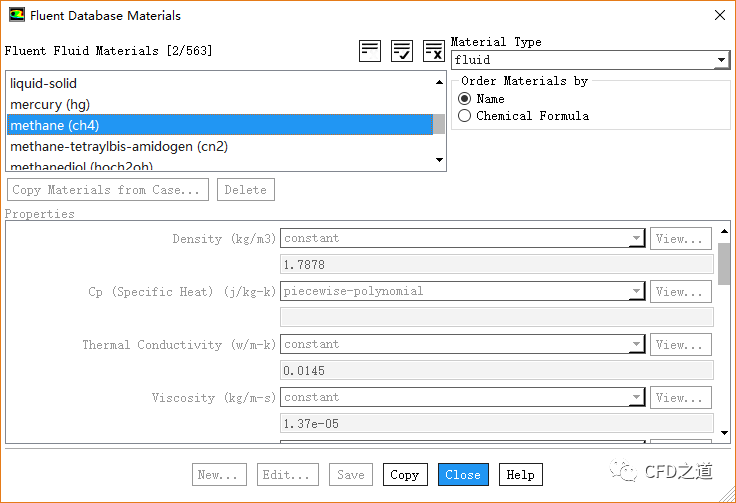 材料数据库对话框中设置Material Type为fluid,并选择材料methane 及carbon-dioxide,点击Copy按钮添加材料