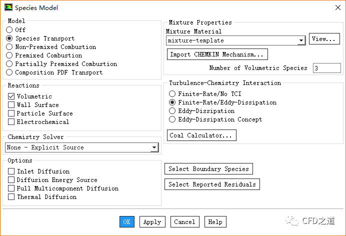 双击模型树节点Models → Species弹出组分输运模型设置对话框