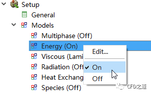 右键选择模型树节点Models > Energy,点击弹出菜单项On激活能量方程