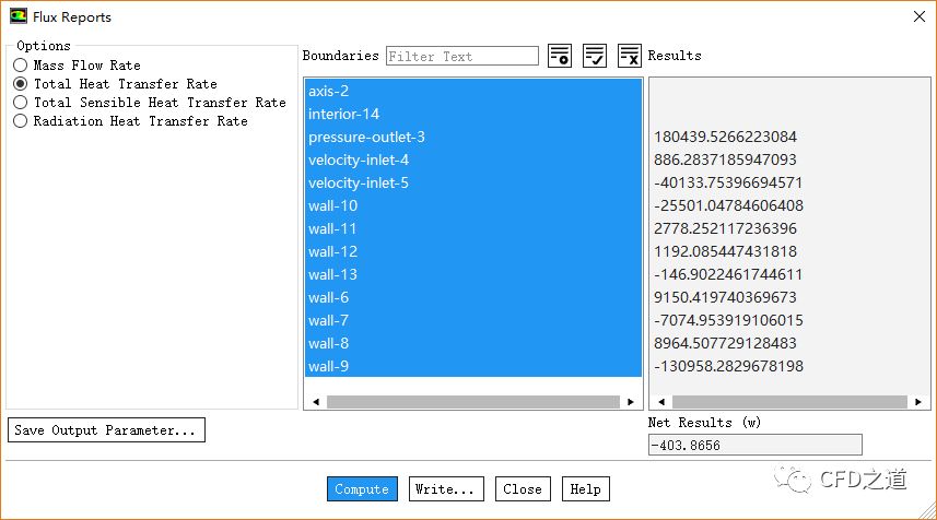 选择Total Heat Transfer Rate,选择边界列表中的所有列表项,点击Compute按钮