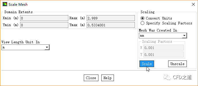 右侧面板中点击按钮Scale...弹出网格缩放对话框,设置Mesh Was Created In为mm,点击Scale按钮缩放网格