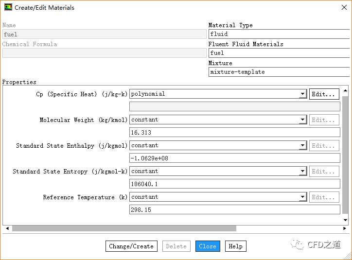 修改材料Methane名称为fuel,去除Chemical Formula中的内容,点击按钮Change/Create修改材料
