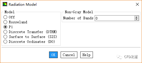 双击模型树节点Models > Radiation弹出辐射设置对话框,选择P1辐射模型