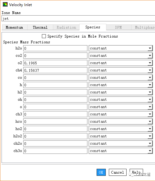 Species标签页下指定o2为0.1965,ch4为0.15637