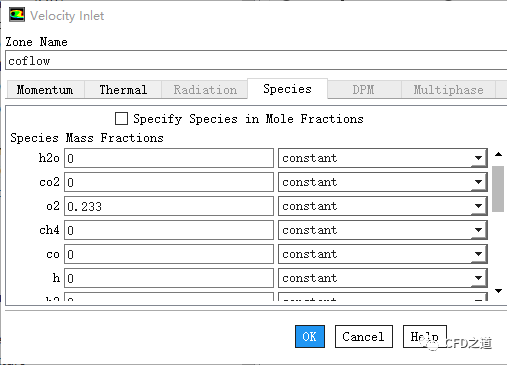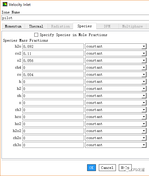 Species标签页下指定h2o为0.092,co2为0.11,o2为0.056,co为0.004