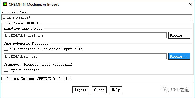 选择导入CH4-skel.che及therm.dat文件,如下图所示,点击Import按钮导入文件