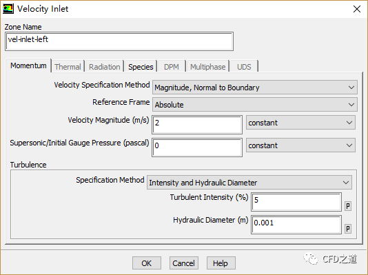 设置Specification Method为Intensity and Hydraulic Diameter,设置Turbulent Intensity为5 %,设置Hydraulic Diameter为0.001 m