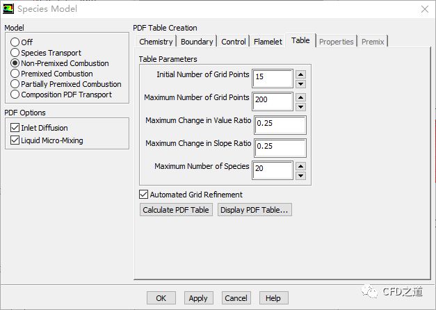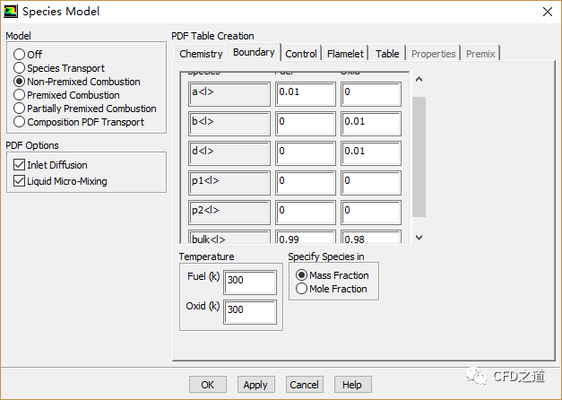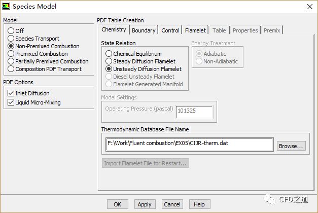 鼠标双击模型树节点Models > Species,弹出对话框中激活选项Unsteady Diffusion Flamelet