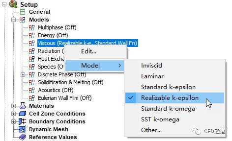 右键选择模型树节点Models > Viscous,选择弹出菜单项Model → Realizable k-epsilon,激活Realizable k-e湍流模型