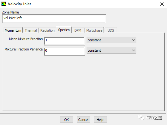 设置Mean Mixture Fraction为1,Mixture Fraction Variance为0,表示该入口为‘fuel’反应物入口