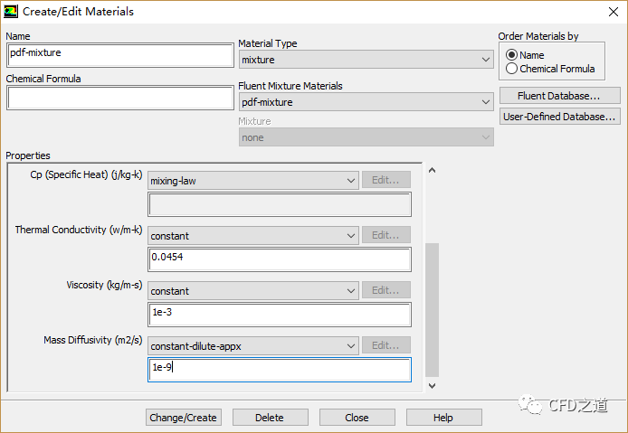 鼠标双击模型树节点Meterials > pdf-mixture,弹出材料定义对话框,按下图所示设置Viscosity及Mass Diffusivity参数值