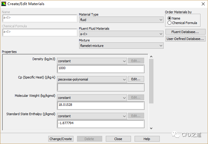 双击模型树节点Materials > Mixture > flamelet-mixture > a(l),弹出材料定义对话框,设置器Desity为1000,如下图所示,点击按钮Change/Create及Close关闭对话框