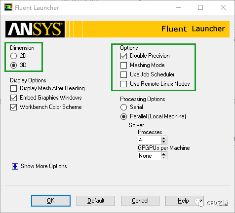 鼠标双击模型树节点Boundary Condtions > pressure-outlet,弹出设置对话框中采用默认设置