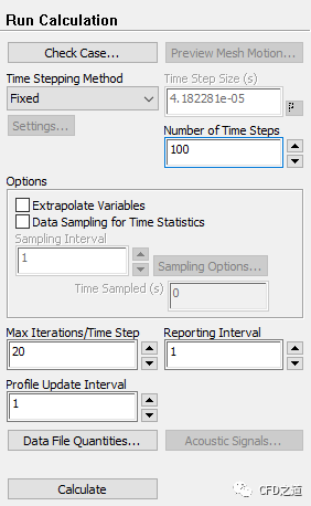 鼠标双击模型树节点Solution > Run Calculation,右侧面板中设置Number of Time Steps为100,其他参数保持默认设置,点击按钮Calculate进行计算