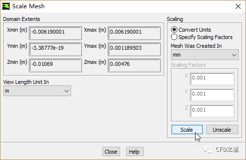 点击右侧面板Scale...,弹出模型缩放对话框,设置Mesh Was Create In为mm,点击按钮Scale缩放网格