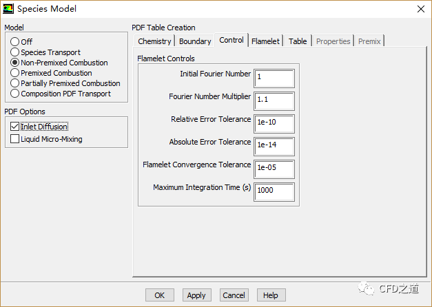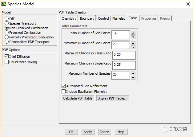 切换至Table标签页,取消选择Include Equilibrium Flamelet选项,其他参数保持默认设置,点击按钮Calculate PDF Table,点击OK按钮关闭对话框