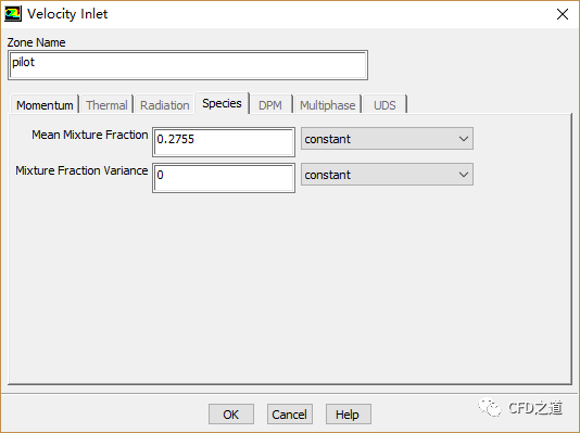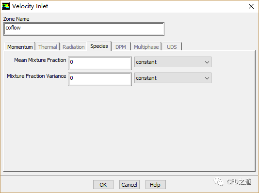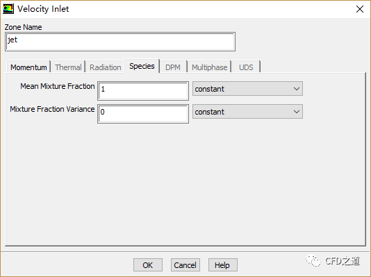 切换之Species标签页,设置Mean Mixture Fraction为1,表示该边界进入的是Fuel
