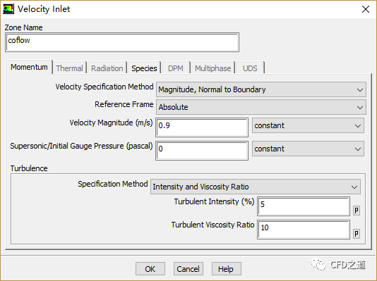 双击模型树节点Boundary Conditions > coflow弹出边界设置对话框