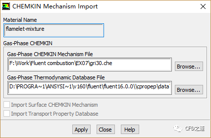 选择Gas-Phase CHEMKIN为gri30.che,点击Apply及Close按钮导入反应机理并关闭对话框